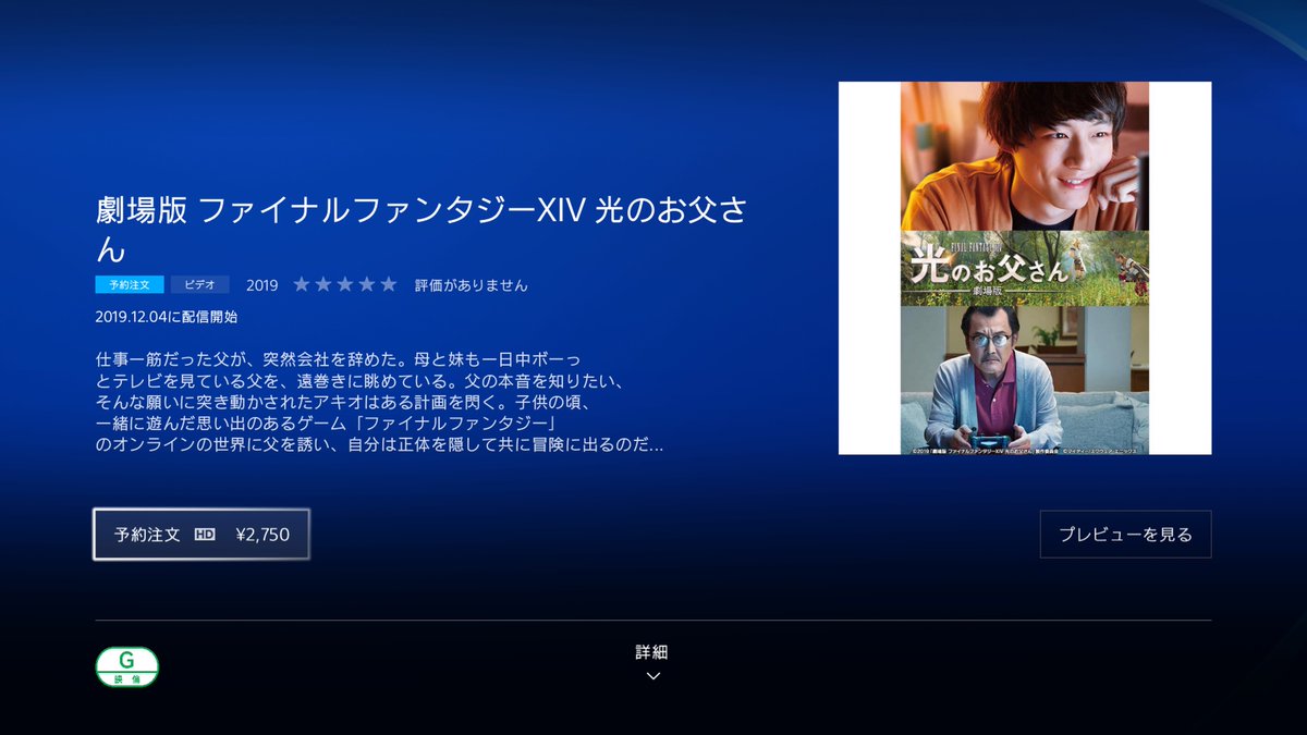 オッサンd A Twitter Ps Storeに劇場版ファイナルファンタジーxiv 光のお父さん予約になってた 多分販売されたらレンタルもありそうだし見に行けなかった人はこれで見れるね 劇場版ファイナルファンタジーxiv光のお父さん Ps4share